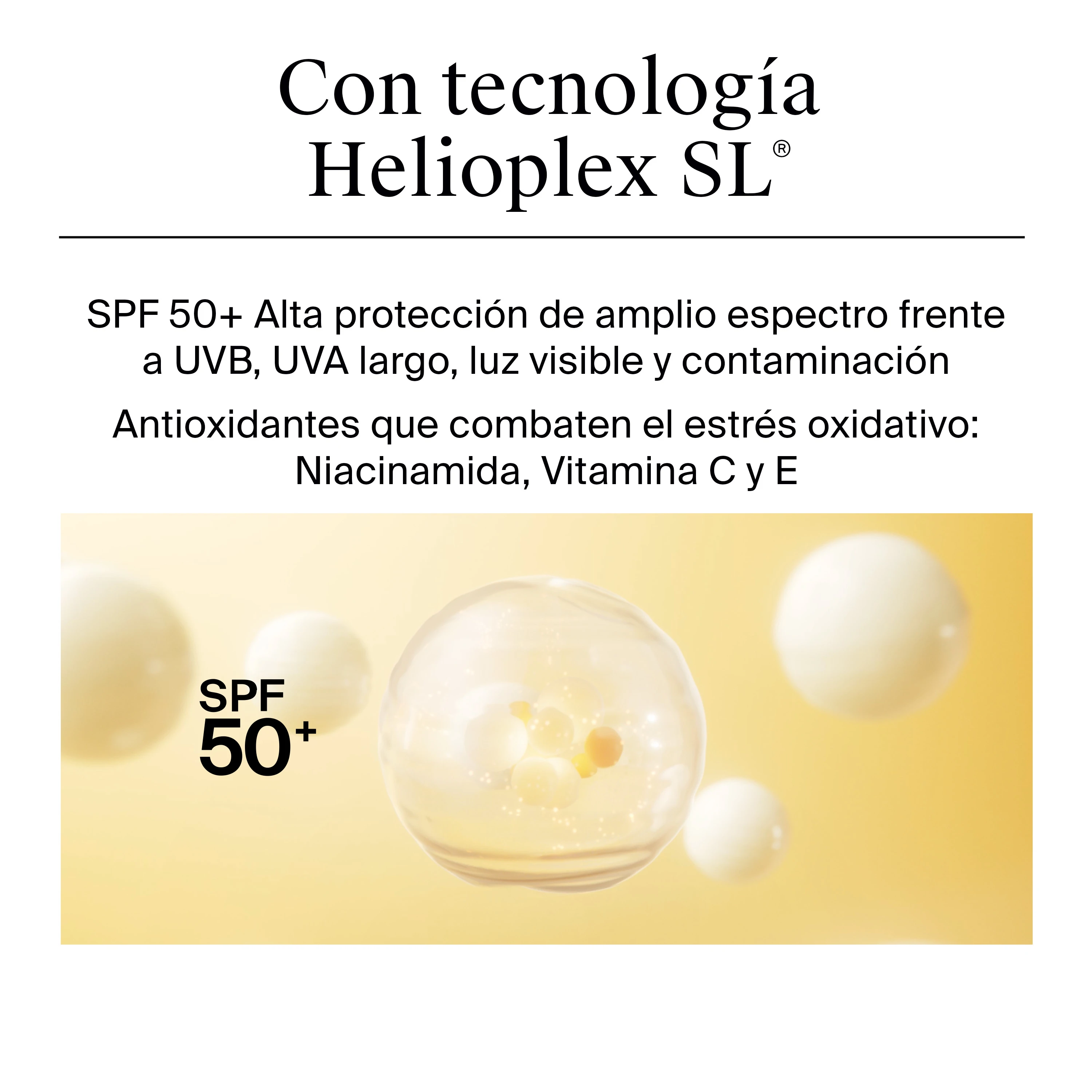 Con tecnología Helioplex SL®, ofrece protección muy alta de amplio espectro frente a UVB, exposición prolongada a UVA, luz visible y contaminación.